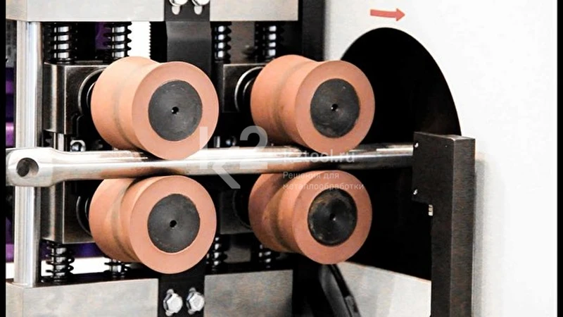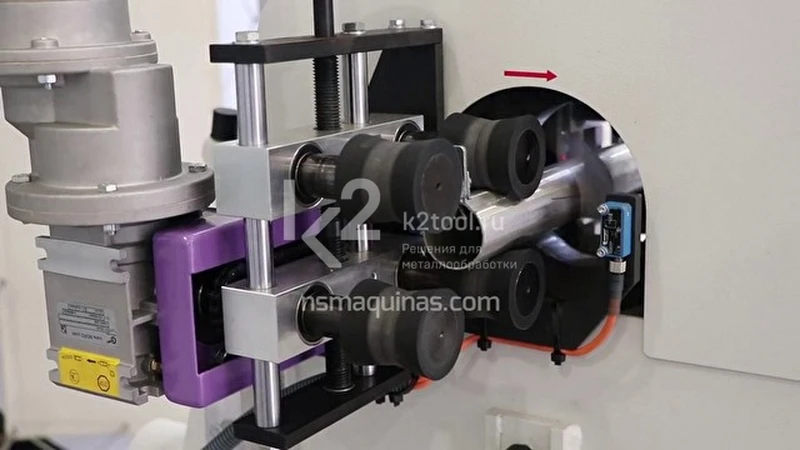 - Автоматическая подача с направляющими роликами позволяет обрабатывать длинные прямые заготовки.