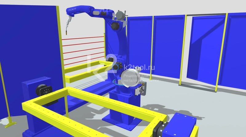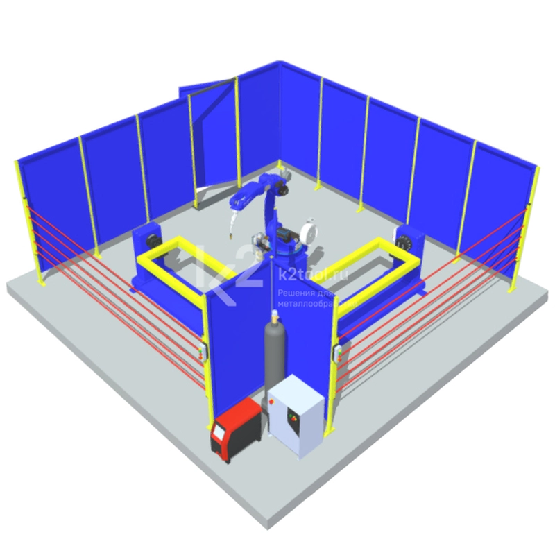 - Непрерывный рабочий процесс: пока в первой рабочей зоне оператор снимает изделие и укладывает заготовки, во второй зоне робот занимается сваркой.