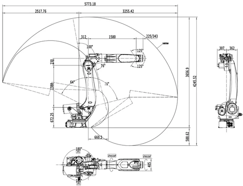 | Диапазон движения по осям | -180°~180° | -14°~154° | -74°~100° | -210°~210° | -125°~125° | -360°~360° |