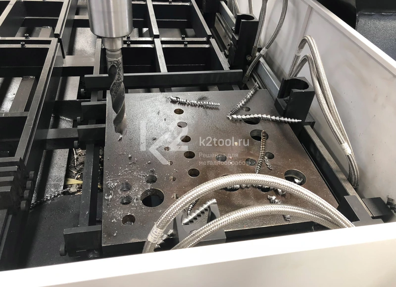 - Сверлильная головка под контролем ЧПУ автоматически оптимизирует скорость подачи и частоту вращения сверла под диаметр отверстия.