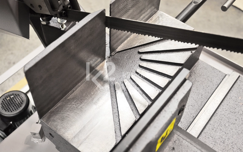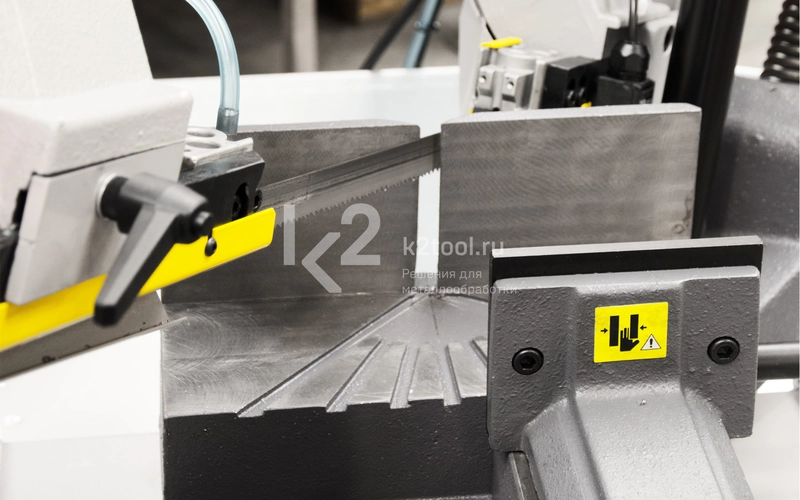 Индикатор контроля напряжения пильного полотна во время работы машины. Твердосплавные направляющие пильного полотна Легкосъемный поддон для стружки и СОЖ Зажимные тиски