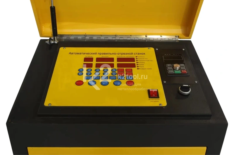 - Пульт управления с ЧПУ позволяет задать размер и количество прутков для автоматической правки и резки. Панель управления оснащена встроенным цифровым вольтметром.