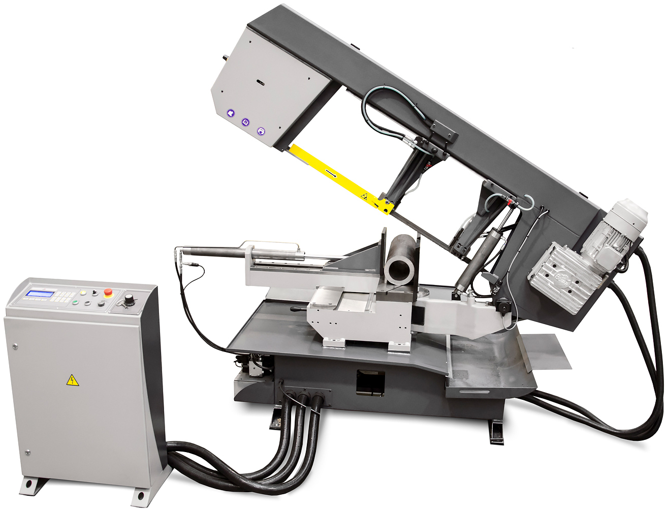 - Возможность автоматического регулирования скорости вращения полотна, скорости опускания и давления пильной рамы.