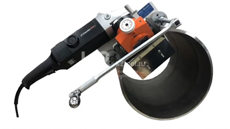 - Специальное приспособление фиксирует фаскосниматель на внешнем периметре трубы, обеспечивая точную обработку и постоянный угол снятия фаски.