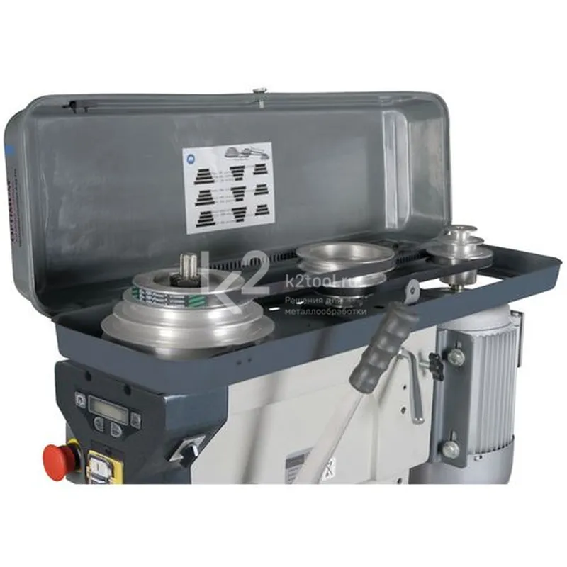 - Металлический кожух, закрывающий ременную передачу, имеет встроенный концевик, который предотвращается случайный запуск сверлильного станка при открытой крышке кожуха.