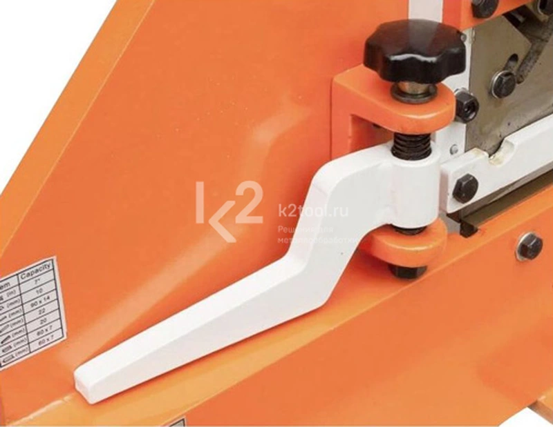 - Резка круглых заготовок диаметром до 22 мм, квадратных до 20 мм, листовой стали толщиной до 10 мм и тавровые балки размером до 60х7 мм.