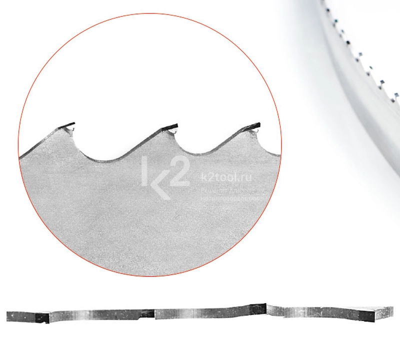 - : Размеры (ширина × толщина) Шаг (кол-во зубьев на дюйм) / Форма зуба мм дюйм 0,85/1,15 1,1/1,6 1,5/2 2/3 34 × 1,1 1 3/8 × 0.042 TSS 41 × 1,3 1 5/8 × 0.050 TSS TSS 54 × 1,3 2 1/8 × 0.050 TSS TSS 54 × 1,6 2 1/8 × 0.063 TSS TSS 67 × 1,6 2 5/8 × 0.063 TSS 80 × 1,6 3 1/8 × 0.063 TSS Форма зуба SET TSS Форма зуба SET TSS дает положительный передний угол в сочетании с увеличенной межзубной впадиной для наилучшего выхода стружки. Подходит для: Универсального использования. Заготовок сплошного сечения, особенно, материалов с внутренними напряжениями. Легированных сталей и сплавов. Высокопроизводительной резки с максимальным ресурсом полотна. Материалы: Низкоуглеродистые конструкционные стали, стали для холодной штамповки, стали для изготовления деталей машин. Высокоуглеродистые конструкционные стали, стали улучшенные закалкой и отпуском. Упрочненные стали, пружинные стали, стали улучшенные закалкой и отпуском. Низколегированные теплоустойчивые стали. Азотированная сталь, высоколегированные теплоустойчивые стали. Инструментальные стали. Нетеплостойкие стали. Быстрорежущие стали. Коррозионно- и кислотостойкие стали, легкообрабатываемые. Коррозионно- и кислотостойкие стали труднообрабатываемые. Жаропрочные стали и сплавы. Сплавы на никелевой основе. Алюминий. Медь. Латунь. Титан, титановые сплавы.