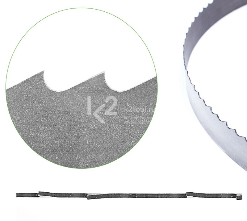 - : Размеры (ширина × толщина) Шаг (кол-во зубьев на дюйм) / Форма зуба мм дюйм 2 3 4 13 × 0,9 1/2 × 0.035 K K 20 × 0,9 3/4 × 0.035 K 27 × 0,9 1 1/16 × 0.035 K K K 27 × 1,1 1 1/16 × 0.042 K 34 × 1,1 1 3/8 × 0.042 K K Форма зуба K Форма зуба K дает положительный передний угол зуба. Подходит для: Универсального использования. Для крупных профилей, заготовок сплошного сечения. Цветных металлов и сталей. Материалы: Алюминий. Медь. Бронза. Латунь.