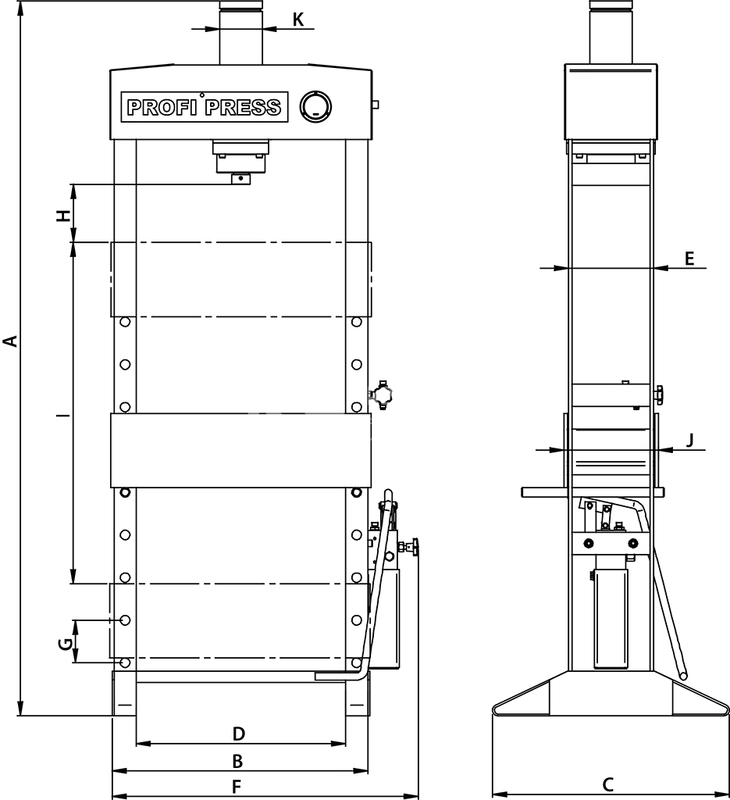 - : Номинальное усилие 147,15 кН Максимальное давление 382,2 бар Ход цилиндра 160 мм Емкость масляного бака 1,65 л Фиксированный цилиндр Есть Моторизированный / ручного управления Управляемый вручную и с фиксированным цилиндром Ширина рабочей зоны 560 мм Диаметр цилиндра 82 мм Диаметр штока 40 мм Диаметр рабочей части штока 50 мм Масса 117 кг Размеры: A: 1880 B: 690 C: 600 D: 555 E: 190 F: 825 G: 100 H: 115 I: 900 J: 215 K: 82 RHTC - Гидравлические прессы HF2, серия PROFI PRESS pdf • 596.7 КБ