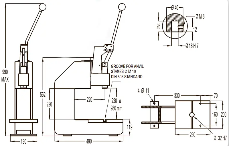 - Опора основания и прижимная головка изготовлены из чугуна FGL 250, что обеспечивает прочность и жесткость.