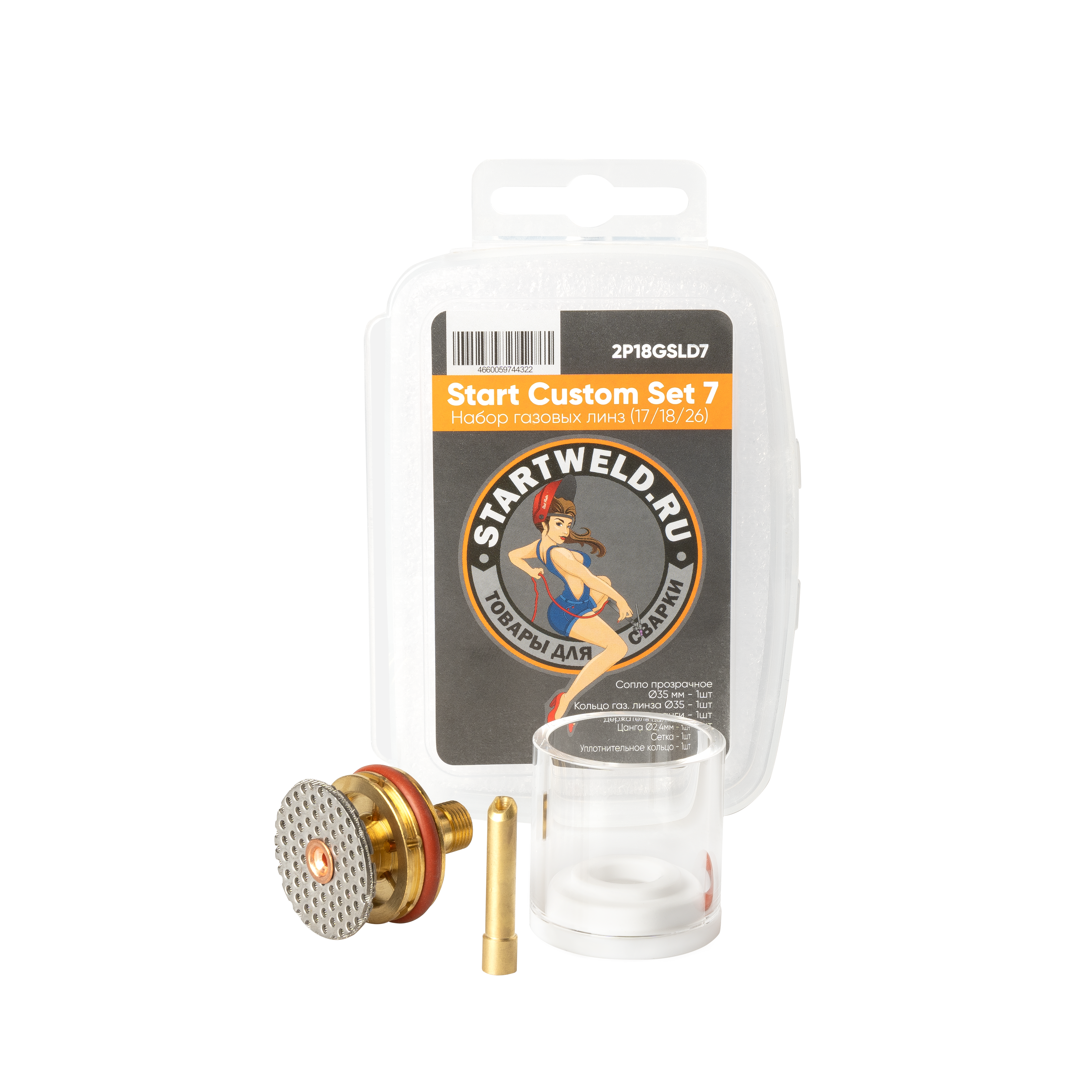 Start Custom Set 7 (17/18/26 TIG L GAS LENS 2.4MM 2P18GSLD7 32.5L) - предназначен для использования с горелками TIG 17/18/26. Линзы прозрачные из специального материала, для максимального контроля и лучшей видимости в процессе сварки, одевается через уплотнительное кольцо.