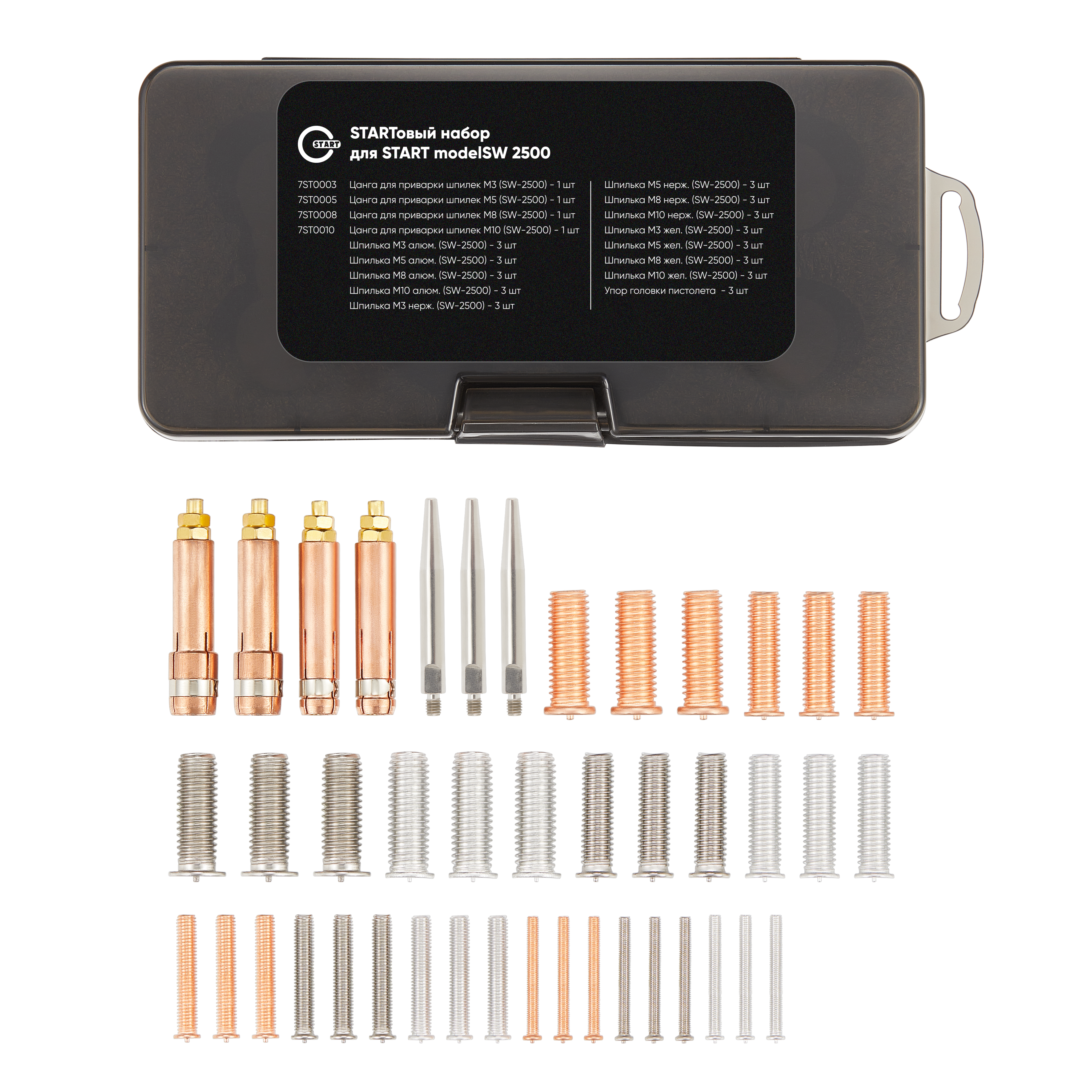 | Аппарат; Сварочный пистолет; Кабель заземления медный 16 мм; Насадка для сварки гвоздей; Руководство пользователя; Гарантийный талон; STARTовый набор modelSW: