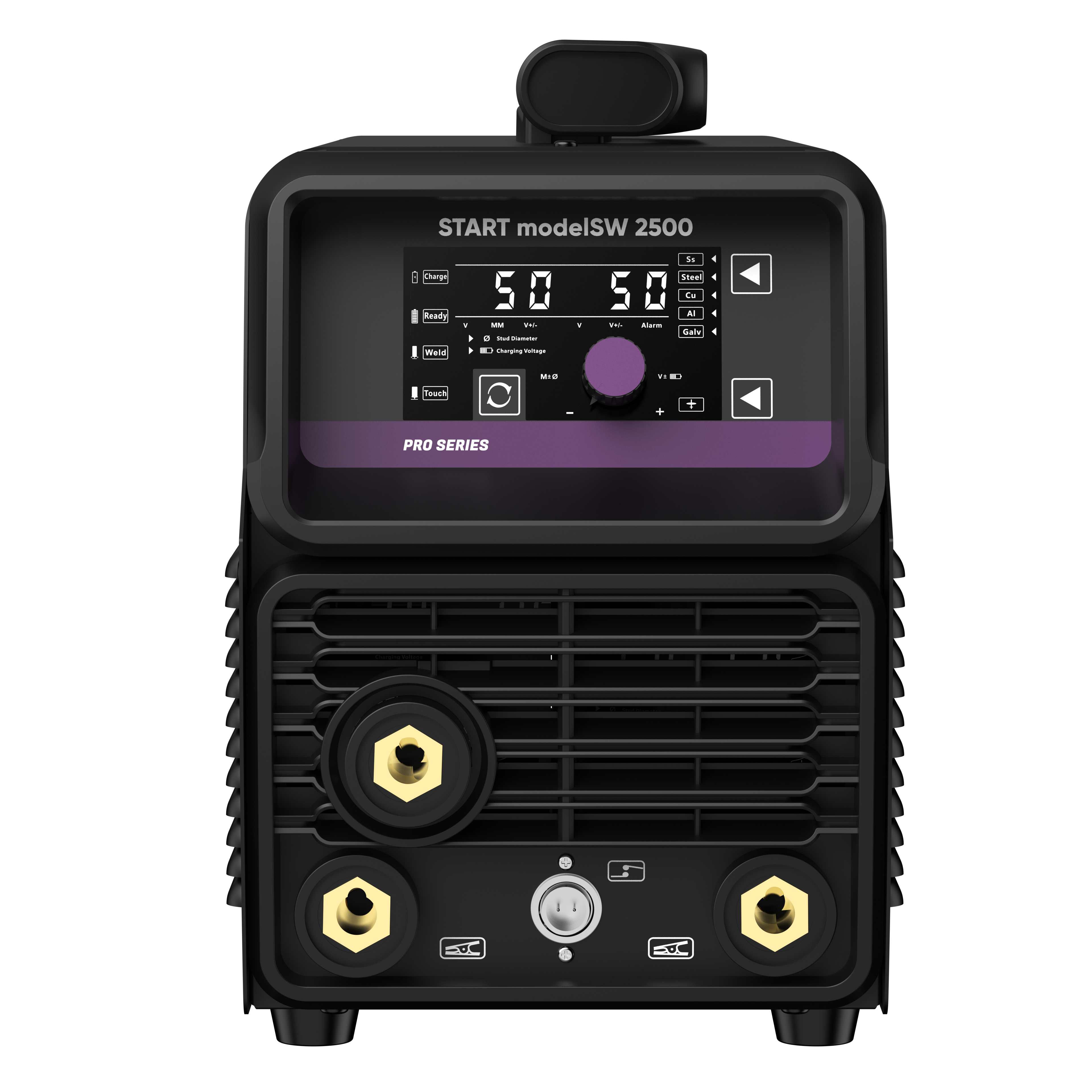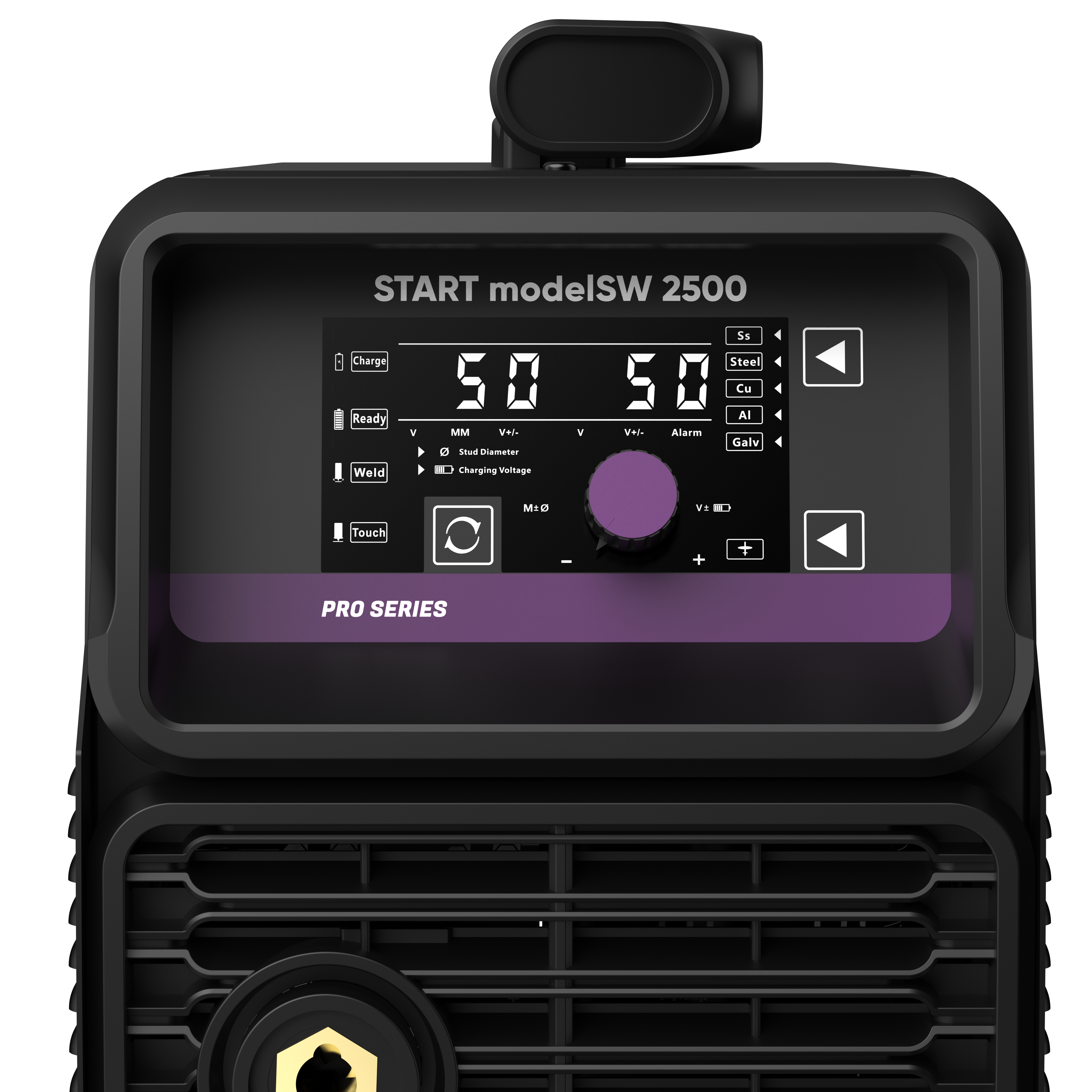 | Кнопки выбора режима сварки и материала шпильки. Переключатель между синергетическим и ручным режимами. Индикаторы: готовности, замыкания, процесса заряда и сварки. Отображение заданного и фактического напряжения. | |