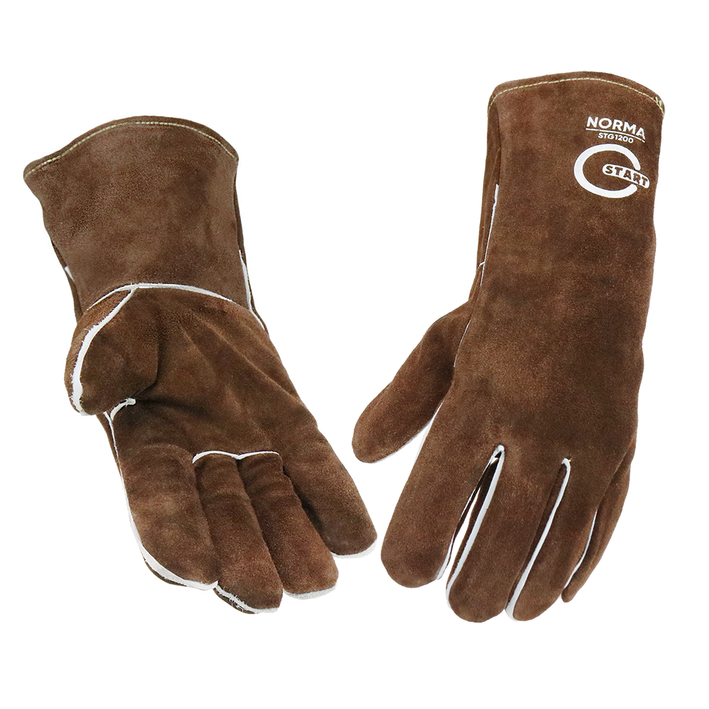 Мягкие и удобные краги сварщика START Norma STG1200 спилковые для защиты от механических воздействий и повышенных температур. Перчатки пятипалые с подкладкой из флиса и брезента, длина 350 мм (+10/-5мм). Окрашенный спилок КРС сорта АВ (1,4 +/- 0,2 мм), обработка, обеспечивающая сохранение мягкости спилка в течение длительного времени хранения, швы усилены вставками из кожи черного цвета, используется специальная упрочненная нить Para Aramid.Перчатки изготавливаются из высококачественного спилка спинной части шкур, не используется заведомо дефектный кожаный или текстильный материал, сохраняются диапазоны толщины для кожаного материала, текстильные материалы единого стандарта (не отход). Краги обеспечивают адекватную механическую защиту, защиту от повышенных температур - открытого пламени, искр и брызг расплавленного металла.