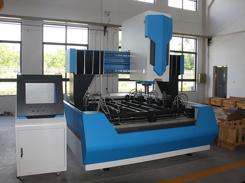 - Высокая производительность: есть два подвижных стола. Когда на одном столе выполняется обработка детали, на другой стол можно загружать или выгружать другую заготовку. Таким образом, машина может работать без остановкию. Внутри рабочего стола установлено 12 подвижных гидравлических зажимов, которые могут быстро и удобно фиксировать детали. Скорость сверлильной головки составляет 12 м/мин; шпиндельная головка оснащена 3 разными быстросменными сверлильными патронами разной длины, которые можно выбирать в зависимости от длины и толщины сверла.