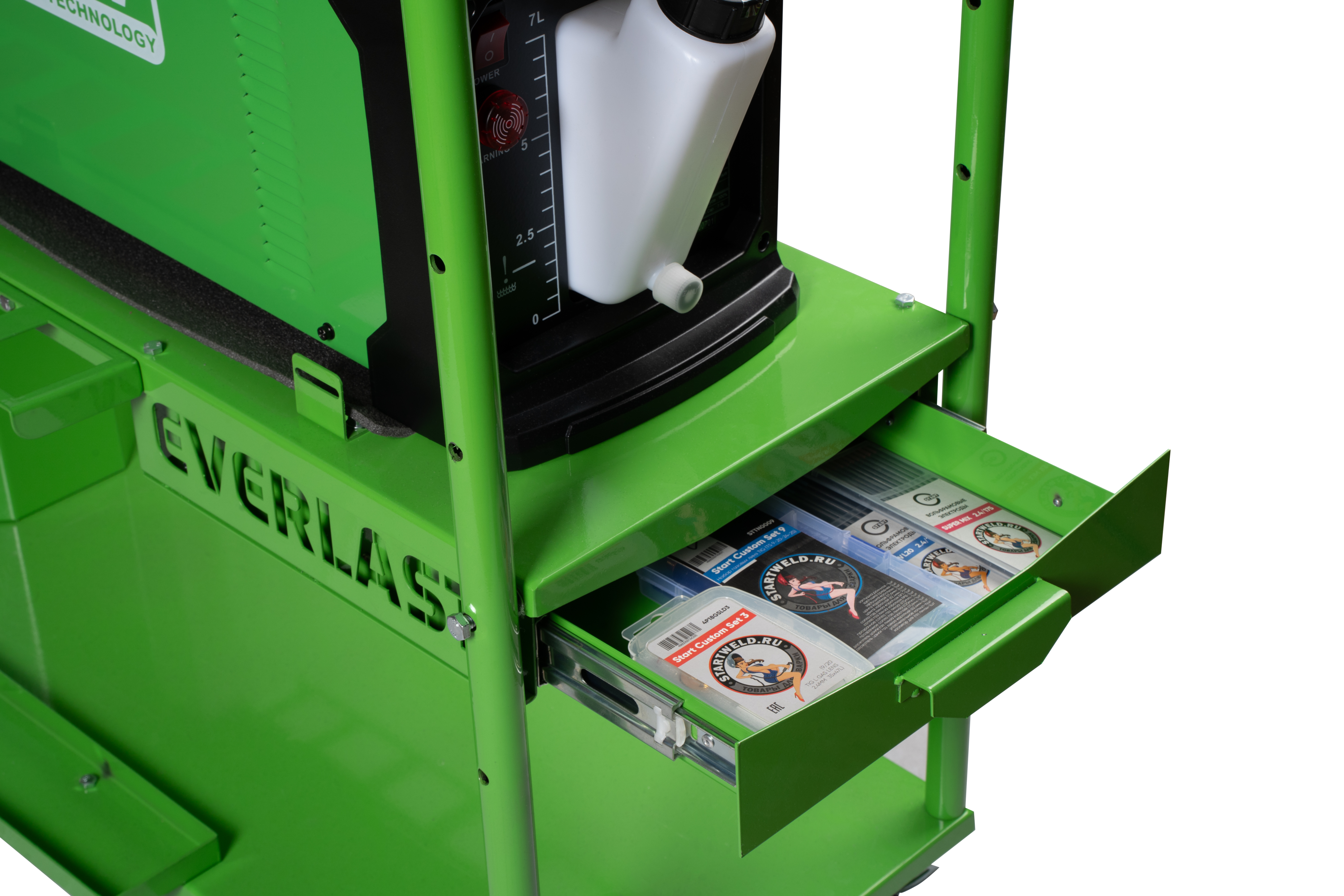 Универсальная тележка с передними поворотными колесами и полками для приспособлений и сварочных материалов. Идеальное решение для удобной и мобильной организации сварочного процесса. Конструкция тележки позволяет размещать источник в паре с блоком водяного охлаждения.- Специальная выдвижная полка для хранения вольфрамовых электродов и расходных материалов;
