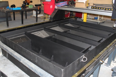 В корпус вставляются ванны (2), которые служат для сбора твёрдых отходов, возникающих в процессе термической резки металла. В каждую секцию корпуса вставляется по одной ванне. Ёмкие пылесборники позволяют реже чистить стол. Верхнюю часть модуля составляют пластины (4), вертикально вставленные в пазы рамы (3). Пластины служат непосредственно для размещения на них обрабатываемых листов. Такая конструкция позволяет во время резки плазме проходить сквозь заготовку, при этом раскаленные отходы не оседают на основании рабочей поверхности. Вес стандартного стола 2000 х 3000 мм составляет 1500 кг. |