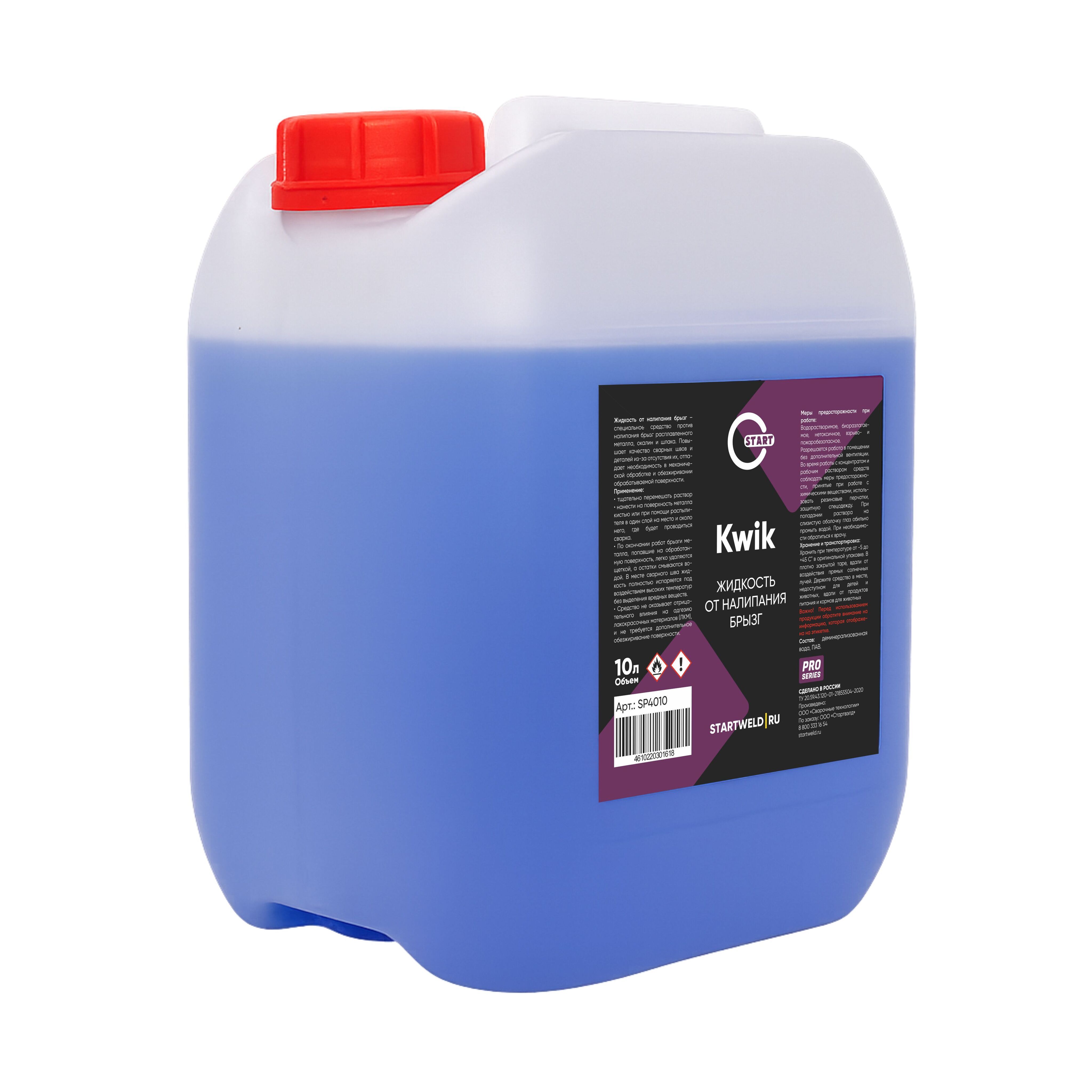 Жидкость от налипания брызг START KWIK 10 л SP4010 – специальное средство против налипания брызг расплавленного металла, окалин и шлака. Повышает качество сварных швов ввиду отсутствия налипших брызг при проведении сварочных работ при MMA и MIG сварки.При использовании данной жидкости отпадает необходимость в механической обработке и обезжиривании обрабатываемой поверхности.